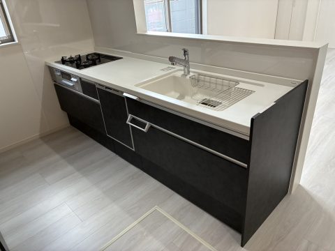 引き締まるお色味のキッチン台とお揃いのカップボードがお洒落です♪